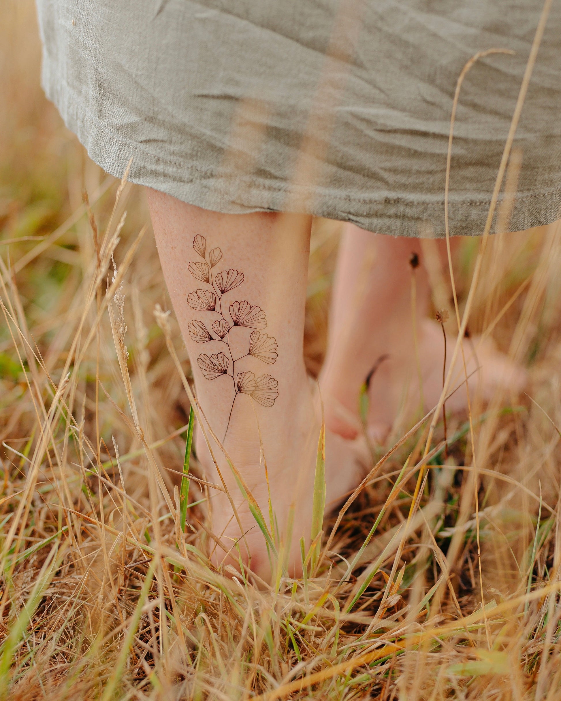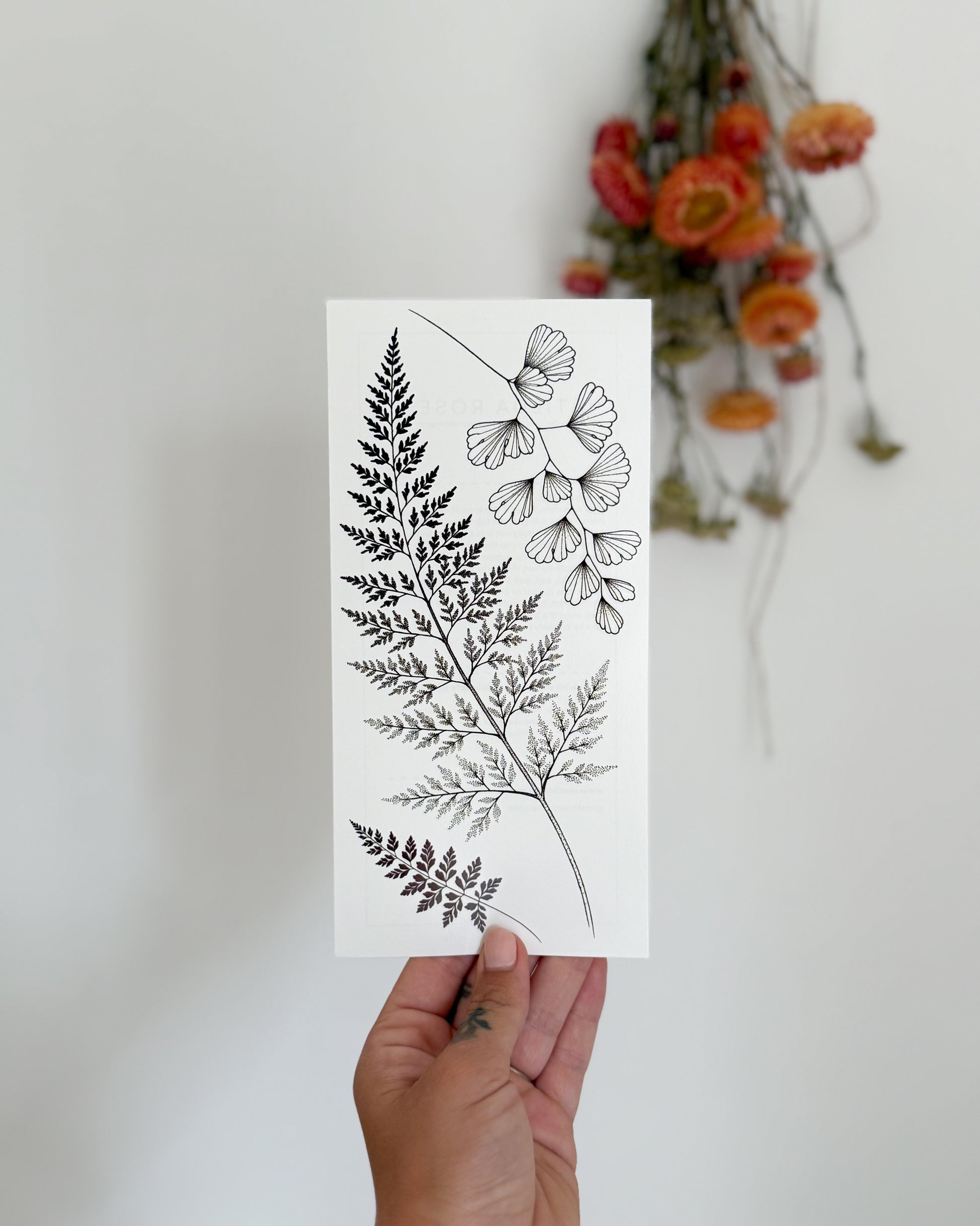 Three delicate ferns, designed by tattoo artist Rachael Ainsworth. Rachael has become well known for her fern designs, it's one of her favourite plants to tattoo. She believes that their fractal nature and the amount of time they've been around (around 360 million years!) really resonate with many of us.