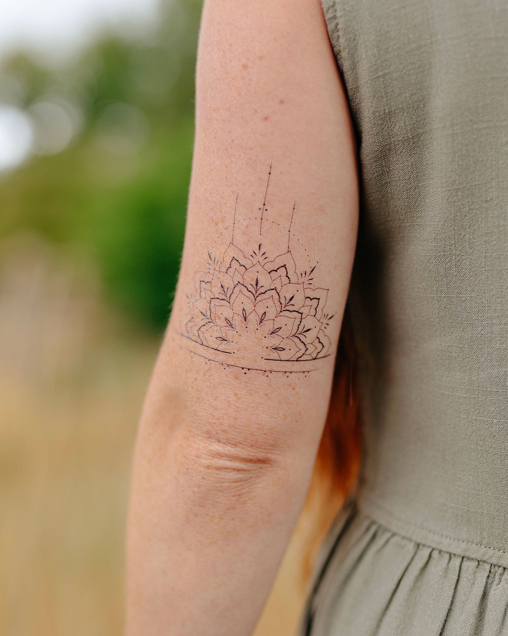 Delicate half mandala, designed by tattoo artist Rachael Ainsworth. One of Rachael's most popular designs over the past few years, they adorn the body like jewellery. This design works really nicely on the wrist, as a cuff on the arm or ankle or on the upper inner forearm.