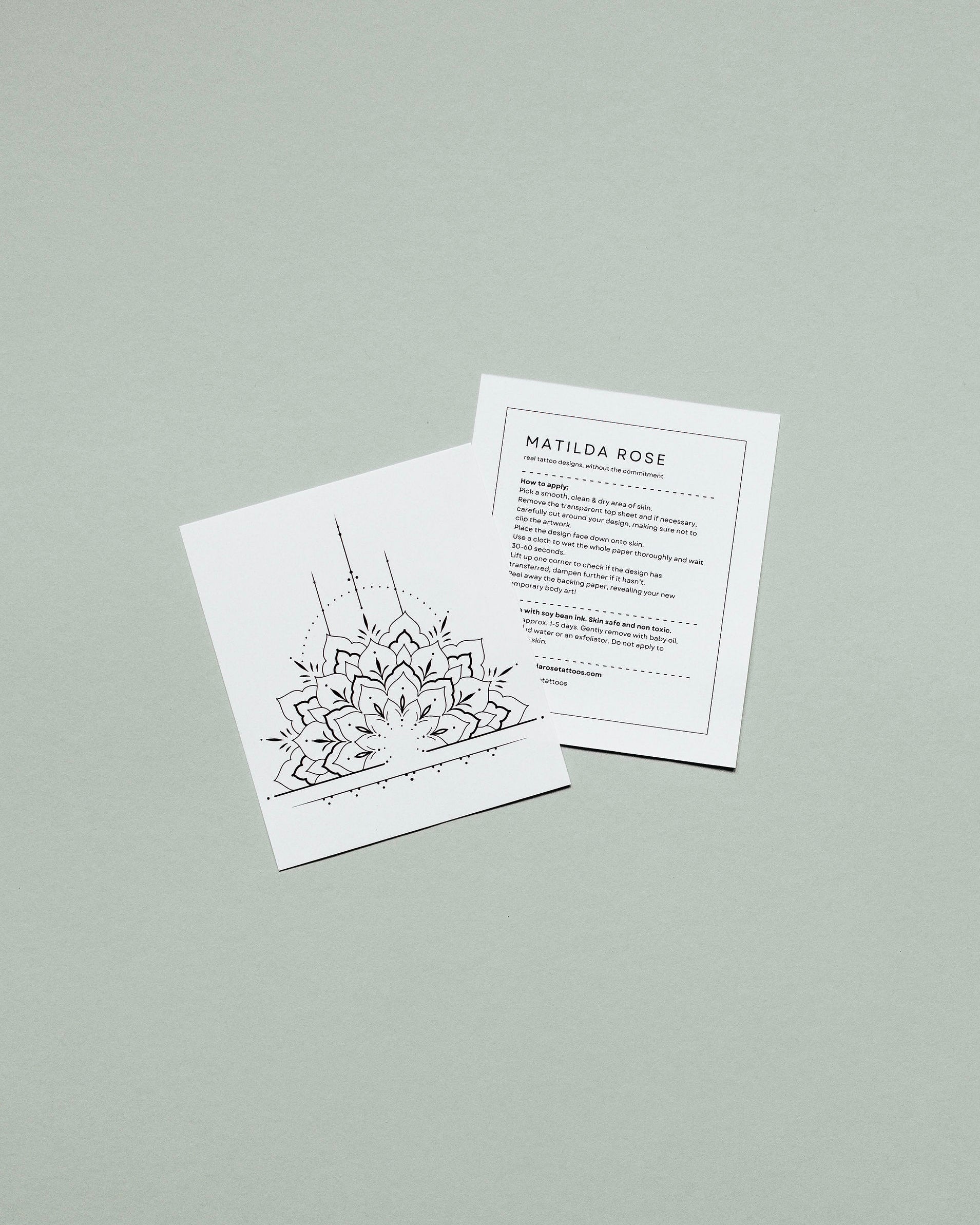 Application instructions are provided on the back of the design. Once applied, this temporary tattoo will last approx. 1-5 days. You can remove early with a gentle skin oil, soap and water or an exfoliator.