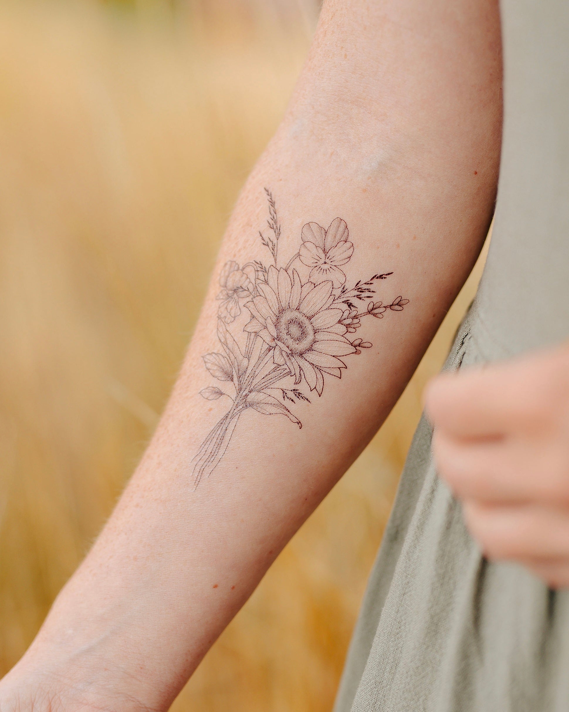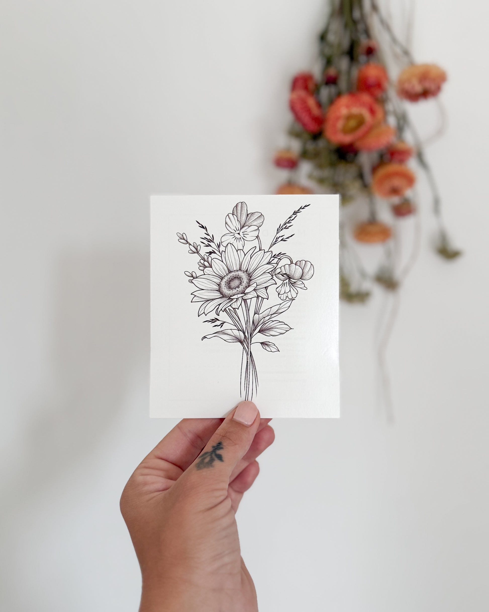 Summer flower bouquet, designed by tattoo artist Rachael Ainsworth. One of your favourite designs from our previous collections. Looks lovely on forearms or ribs although it's versatile enough for you to get creative with the placement. Flowers include; Sunflower, Pansy and Lavender.