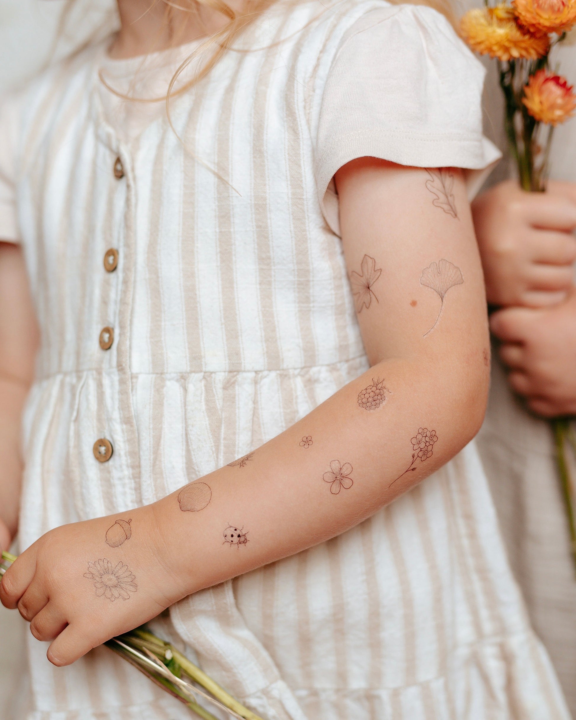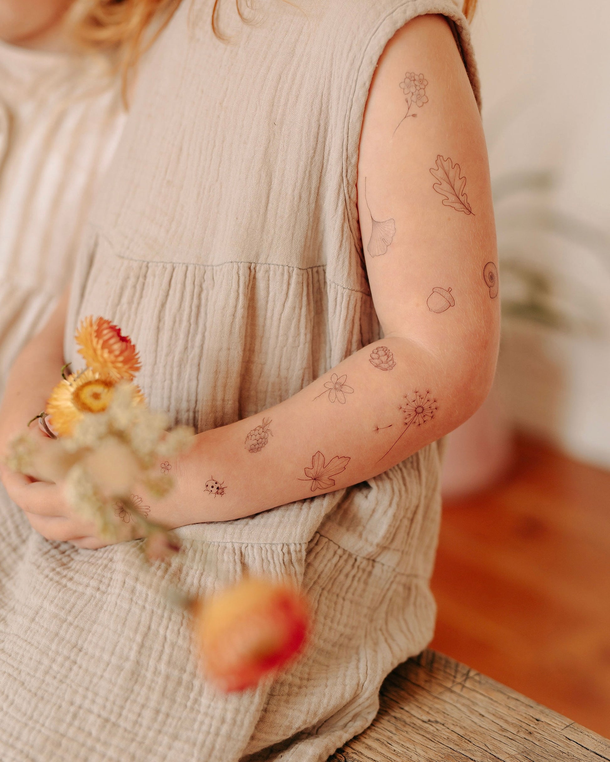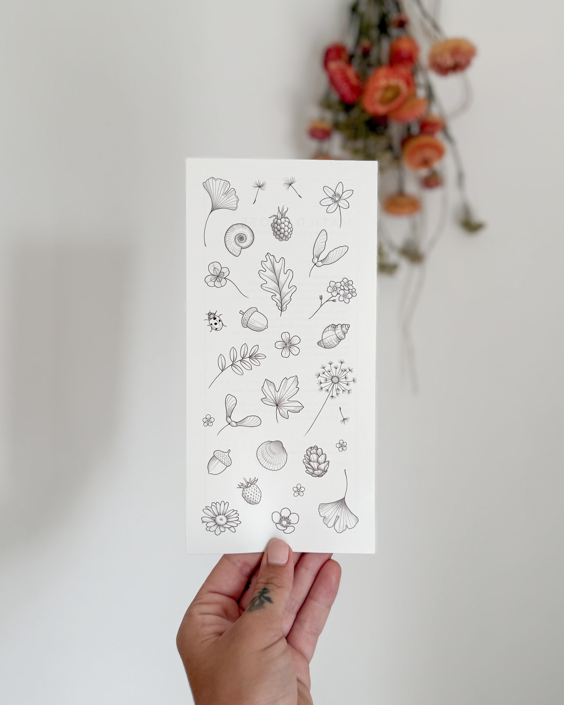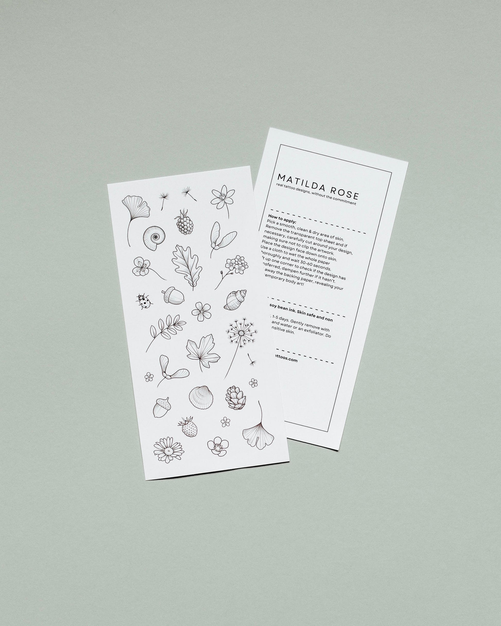 Mini nature themed temporary tattoos designed by tattoo artist Rachael Ainsworth. This sheet is inspired by the items her daughter Matilda collects when they are spending time together outdoors. Designed to be enjoyed and shared between grown ups and children. Great if you want to try out a small design or if you want to have fun creating your own composition.