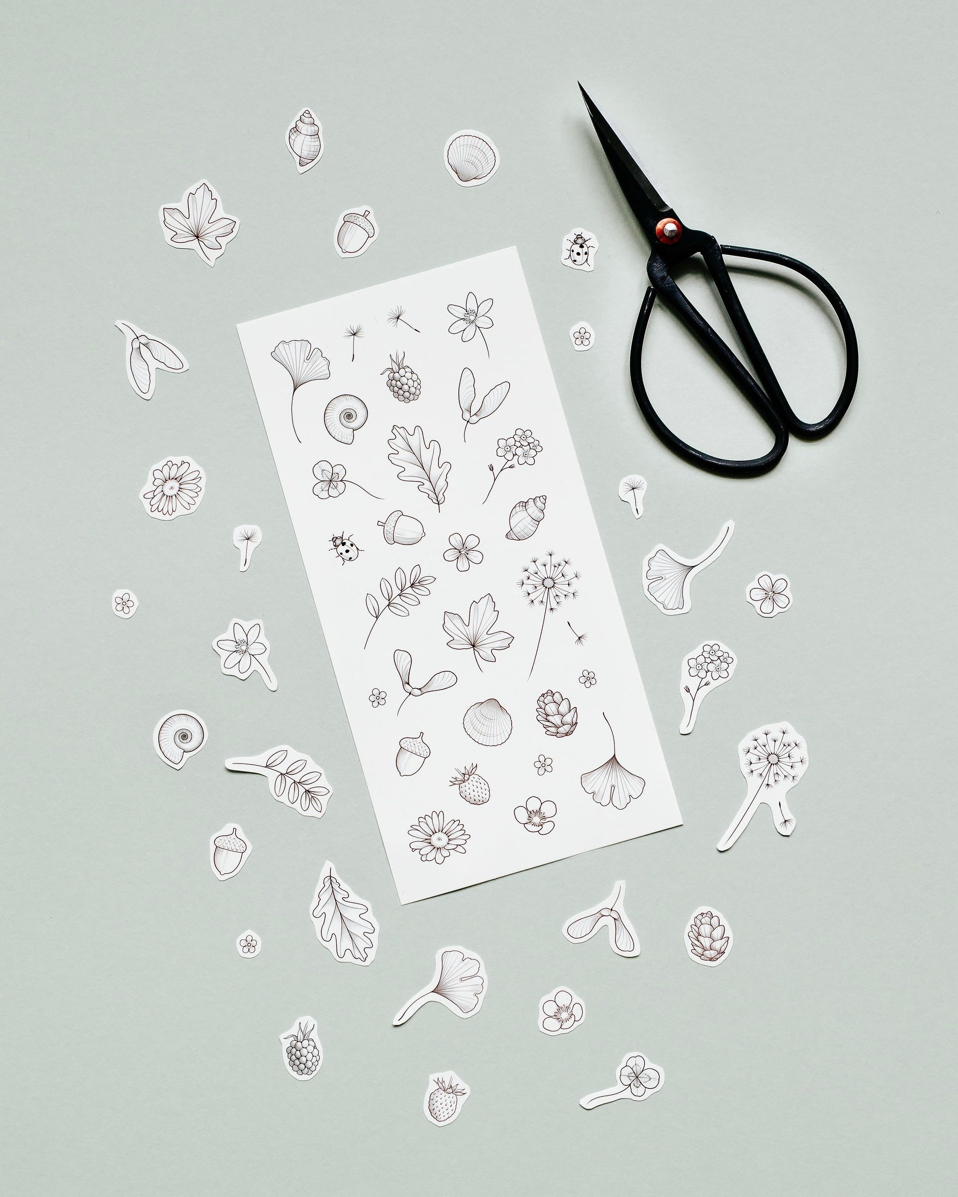 On this sheet you can find; a ladybird, ginko leaves, acorns, elderflower flowers, a strawberry, a blackberry, a daisy, a wood anemone, forget-me-nots, a daisy, a dandelion seedhead and seeds, a strawberry flower, helicopter seeds, shells, an ammonite, a four leaf clover, an oak leaf, a maple leaf and a rowan leaf.